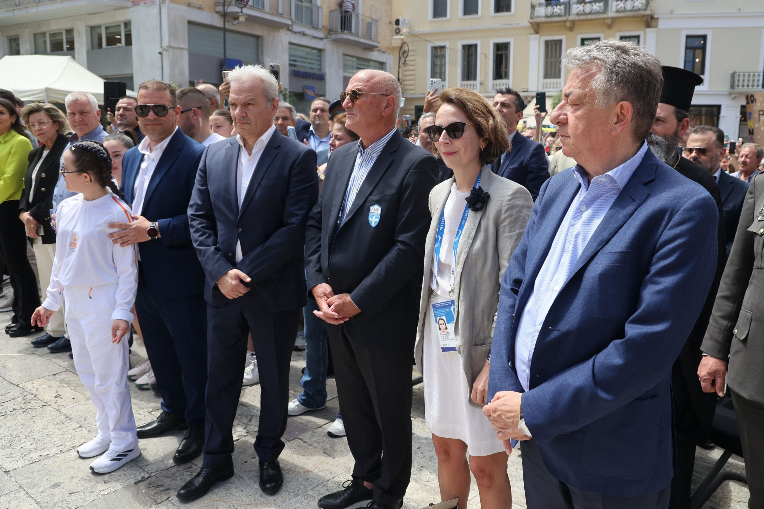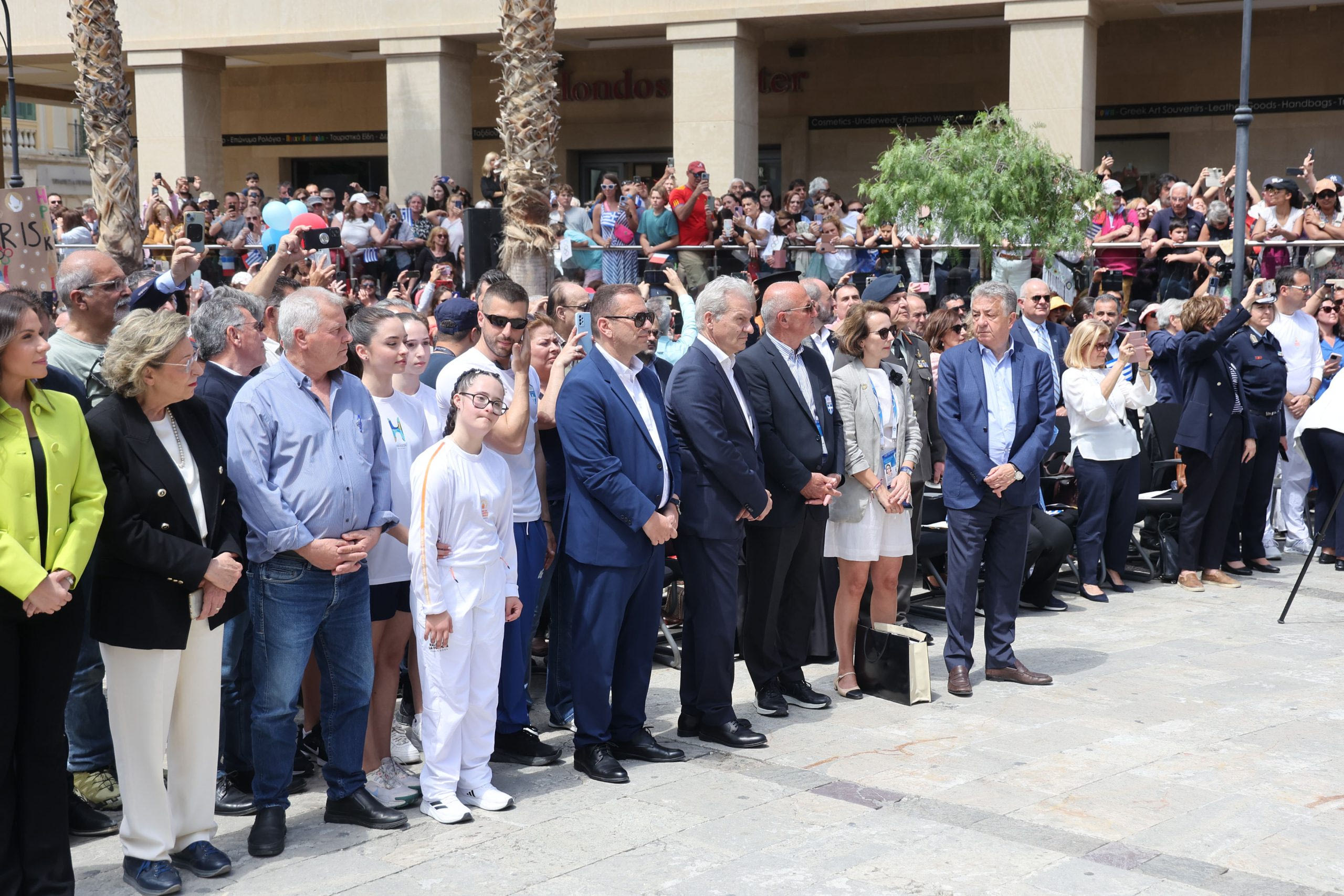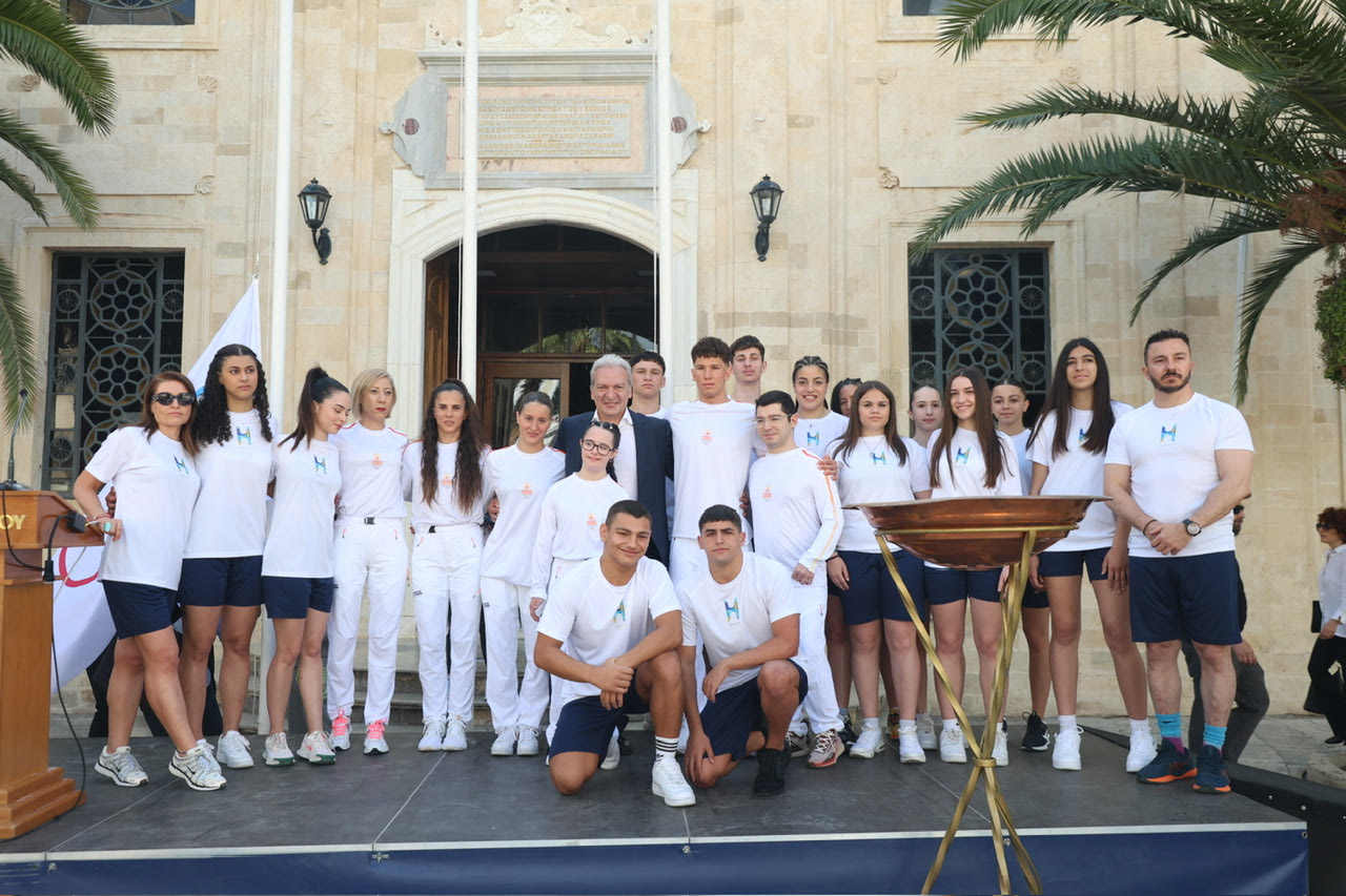 O Δήμαρχος Ηρακλείου Αλέξης Καλοκαιρινός, ο Περιφερειάρχης Κρήτης Σταύρος Αρναουτάκης, ο αντιδήμαρχος Αθλητισμού Γιάννης Τσαπάκης, η Γαλλίδα εκπρόσωπος της οργανωτικής Επιτροπής των Αγώνων Véronique Bruezο, ο Θανάσης Βασιλειάδης από την ΔΟΕ καθώς και αρκετοί τοπικοί παράγοντες, μαθητές από δεκάδες σχολεία του Ηρακλείου παρακολούθησαν την τελετή στην πλατεία του Αγίου Τίτου, υπό την Φιλαρμονική Δήμου Ηρακλείου.