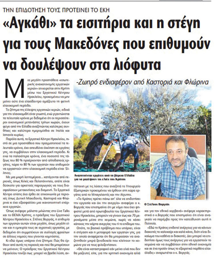 Χθες, η διοίκηση του Εργατικού Κέντρου Ηρακλείου, ο πρόεδρος της Οργάνωσης Αμπελουργών και Ελαιοπαραγών Κρήτης και πρόεδροι από τα Εργατικά Κέντρα Καστοριάς και Φλώρινας συναντήθηκαν με τον υπουργό Αγροτικής Ανάπτυξης και Τροφίμων, κ. Γιώργο Γεωργαντά, από τον οποίο ζήτησαν να δοθούν επιδοτήσεις στους εργάτες γης για να έρθουν στην Κρήτη. Το μεροκάματο δεν αρκεί για να αφήσει κανείς το σπίτι του τον χειμώνα, θα πρέπει να βοηθηθεί όσο αφορά στη μετακίνησή του αλλά και το ενοίκιο που θα κληθεί να καταβάλλει.