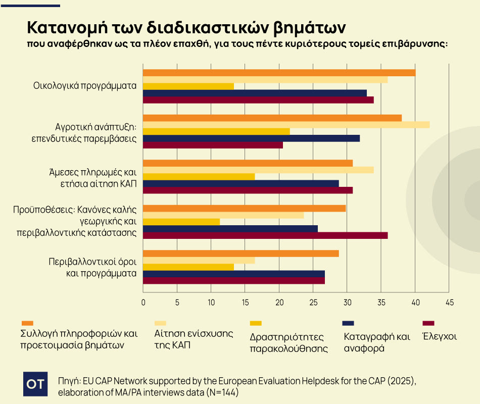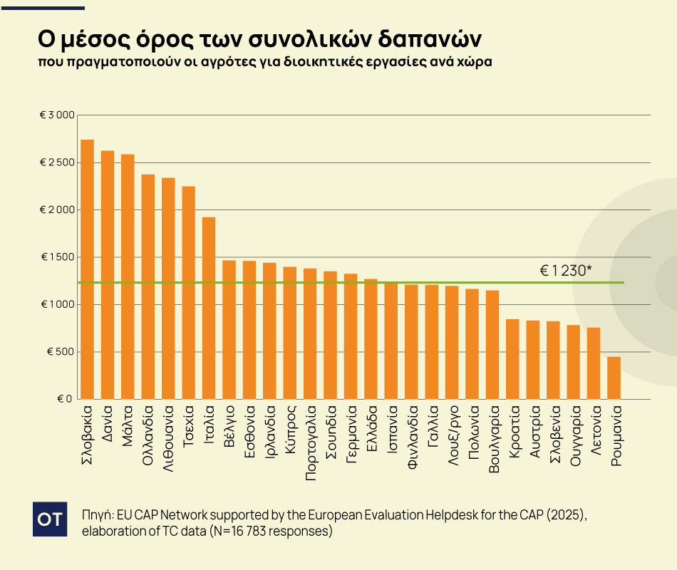 Χαρακτηριστικό είναι ότι οι αγρότες της ΕΕ καλούνται να πληρώσουν για τις διοικητικές δαπάνες σε ετήσια βάση περίπου 1.230 ευρώ, ποσό που καταβάλουν για να υποβάλουν αιτήσεις και να λάβουν ενισχύσεις από την ΚΑΠ, ενώ λόγω της πολυπλοκότητας των διαδικασιών, ο εκτιμώμενος χρόνος που απαιτείται για τις γραφειοκρατικές υποχρεώσεις κυμαίνεται από 5,6 έως 8,7 εργάσιμες ημέρες ετησίως.