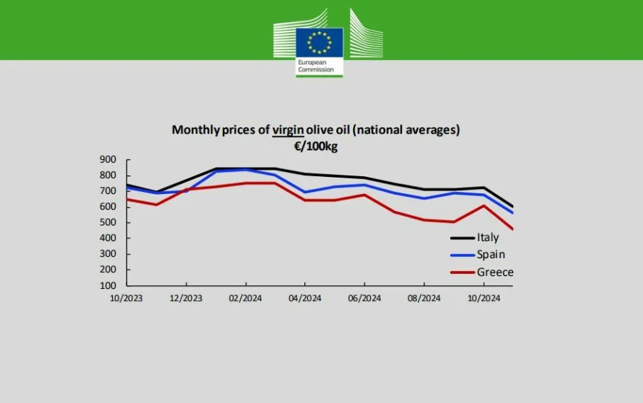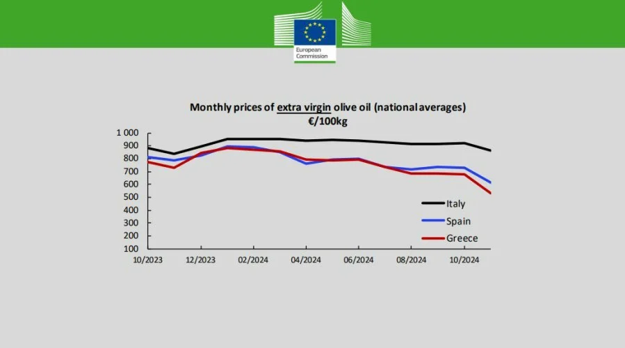 Οι τιμές για το έξτρα παρθένο ελαιόλαδο στην Ελλάδα, το Νοέμβριο, διαμορφώνεται στα 5,33 ευρώ το κιλό, ενώ στην Ισπανία στα 6,15 ευρώ και στην Ιταλία στα 8,61 ευρώ