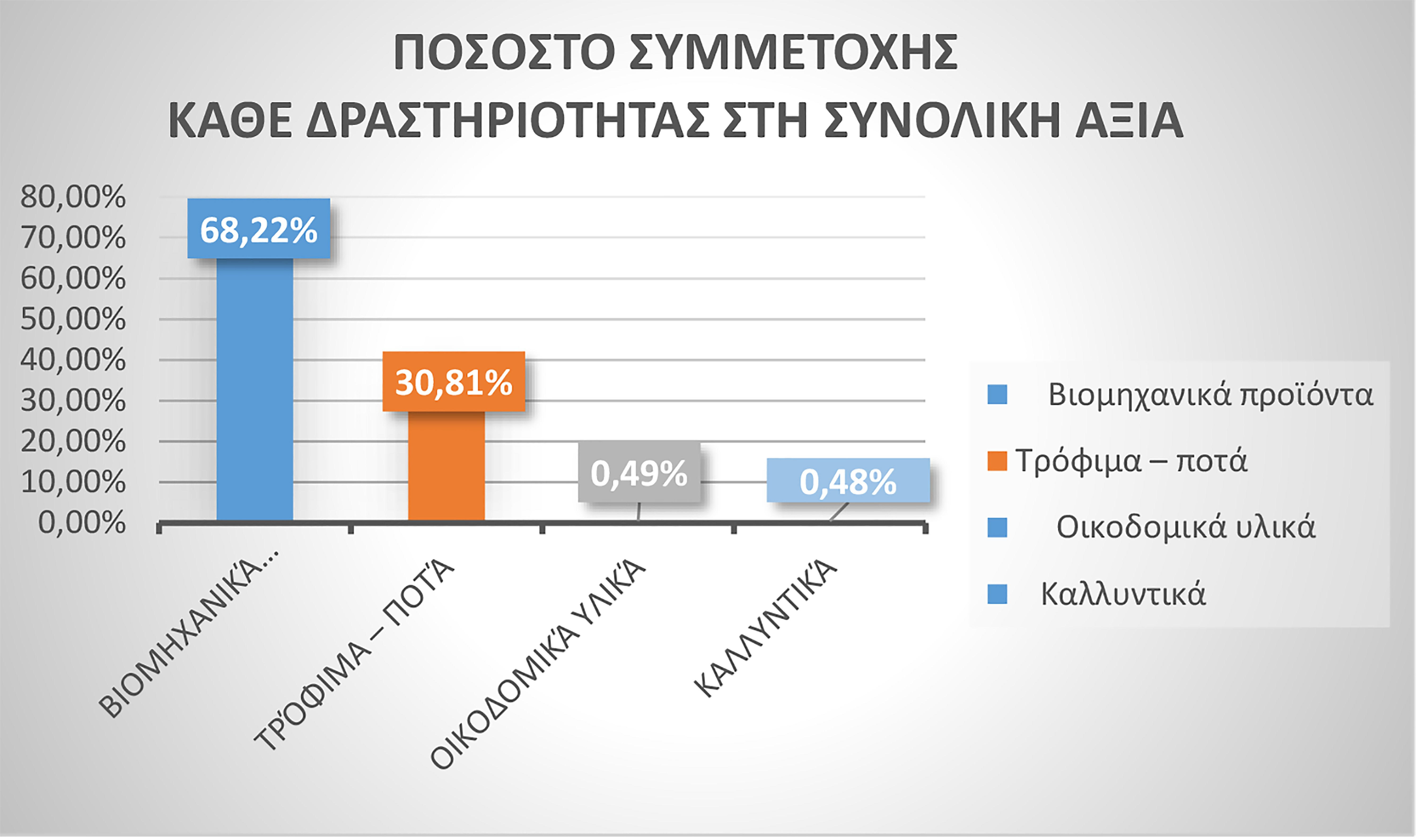 Βιομηχανικά προϊόντα: Τα βιομηχανικά προϊόντα αντιπροσωπεύουν το 68,22% της συνολικής αξίας, δηλαδή 29.550.787,20 ευρώ