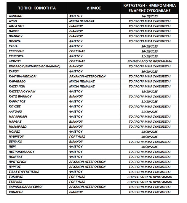 Σύμφωνα με την ανακοίνωση, το πρόγραμμα δολωματικών ψεκασμών για τη φετινή περίοδο (2025–2026) ολοκληρώθηκε, με εξαίρεση ορισμένες Τοπικές Κοινότητες που περιλαμβάνονται σε σχετικό πίνακα της Υπηρεσίας. Σε κάποιες από αυτές έχει ήδη οριστεί η ημερομηνία έναρξης της συγκομιδής, ενώ για τις υπόλοιπες θα υπάρξει νέα ενημέρωση.