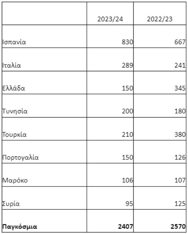 Συγκεκριμένα, η εκτιμώμενη παραγωγή ελαιολάδου εσοδείας 2024/25 (ποσότητες σε χιλιάδες τόνους) έχει ως εξής: