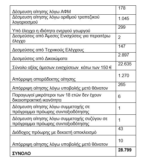 Οι υπόλοιπες κατηγορίες, που αφορούν συνολικά σε 28.799 μοναδικά ΑΦΜ και που δε συμπεριλήφθηκαν και αυτά στην πληρωμή είναι: