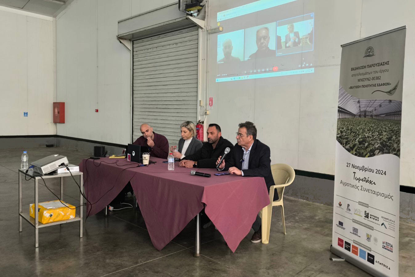 Με επιτυχία ολοκληρώθηκε η εκδήλωση παρουσίασης των αποτελεσμάτων του έργου Μ16ΣΥΝ2-00382 “Βελτίωση Ποιότητας Εδαφών“, η οποία πραγματοποιήθηκε στις 27 Νοεμβρίου 2024, στην έδρα του Αγροτικού Οπωροκηπευτικού – Ελαιουργικού Συνεταιρισμού Τυμπακίου.