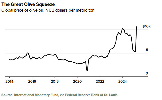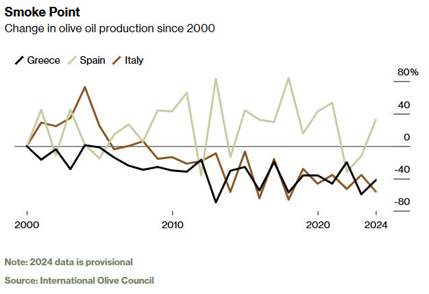 Η ζήτηση για ελαιόλαδο έχει εκτοξευθεί, ενώ η προσφορά μειώνεται. Οι κλιματικές συνθήκες έχουν μετατρέψει το ελαιόλαδο σε «υγρό χρυσάφι». Η Ελλάδα, αν και μικρότερη από Ισπανία και Ιταλία, επηρεάζεται περισσότερο από την ξηρασία και τις πυρκαγιές. Σύμφωνα με την Eurostat, οι ζημιές του 2023 υπολογίζονται σε περίπου 400 δολάρια ανά κάτοικο. Πάνω από 11.000 στρέμματα ελαιώνων χάθηκαν πέρυσι.