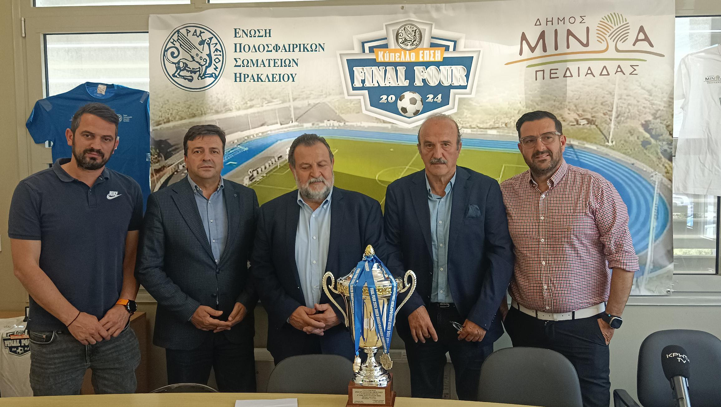 Παρουσία των διοργανωτών Δήμου Μινώα Πεδιάδας, ΕΠΣΗ και Περιφέρειας Κρήτης και των προπονητών και ποδοσφαιριστών των τεσσάρων φιναλίστ, φιλοξενήθηκε σήμερα στο δημαρχείο Μινώα Πεδιάδας η συνέντευξη Τύπου για το 3ο Final Four του Κυπέλλου ΕΠΣΗ.