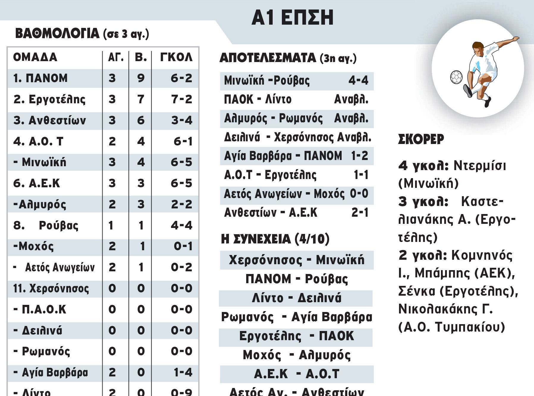 Ο ΠΑΝΟΜ είναι η μοναδική ομάδα που συνεχίζει χωρίς βαθμολογικές απώλειες στην φετινή Α1, έχοντας κερδίσει και τρία ματς που έχει δώσει έως τώρα και εκμεταλλευόμενος την ισοπαλία του Εργοτέλη στο Τυμπάκι, «στρογγυλοκάθισε» στην κορυφή του πρωταθλήματος, μετά τις αναμετρήσεις της (και πάλι) «λειψής» 3ης αγωνιστικής (τρία ματς δεν έγιναν).