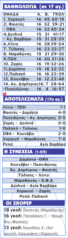Τους ίδιους βαθμούς (32) με την ομάδα της Μεσαράς, έχει συγκεντρώσει και ο ΟΦΑ. Το 2-0 επί των Κουνάβων στο Αρκαλοχώρι «υπέγραψαν» οι Κενδριστάκης, Μηλάκης. Χωρίς γκολ (0-0) ολοκληρώθηκε η αναμέτρηση του Ζαρού με τα Δειλινά, ενώ νικητή δεν ανέδειξε και ο αγώνας του Λίντο με τον ΠΟΗ (1-1).