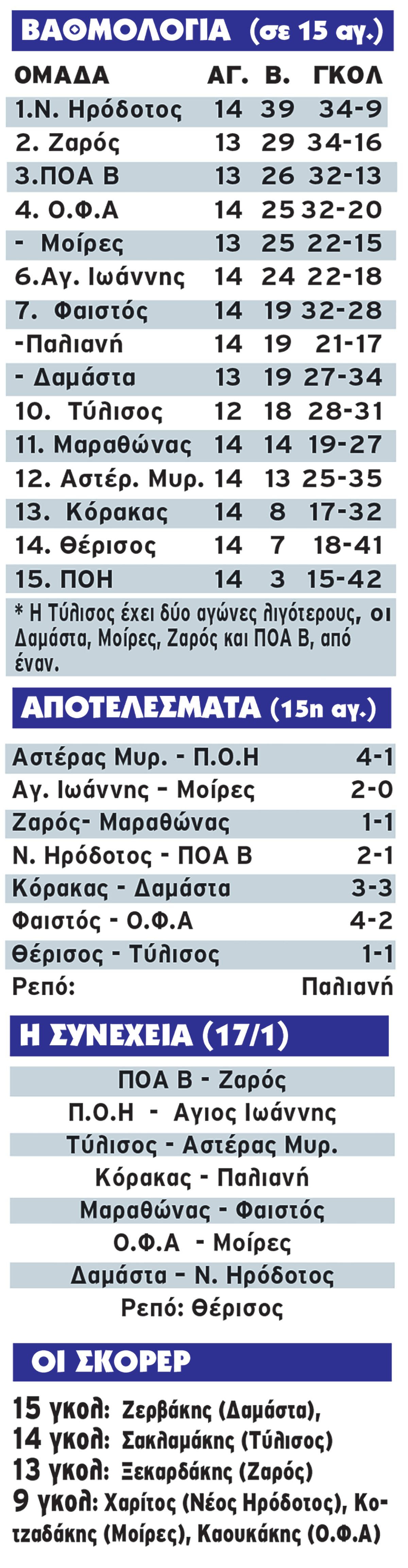 Συνεχίζεται το… πάρτι του Νέου Ηροδότου (11η συνεχόμενη νίκη) στην Α2 ΕΠΣΗ, αφού αύξησε στους 10 βαθμούς την διαφορά από τον δεύτερο Ζαρό, στο φινάλε του πρώτου γύρου (15η αγωνιστική) και στο ξεκίνημα του 2026.