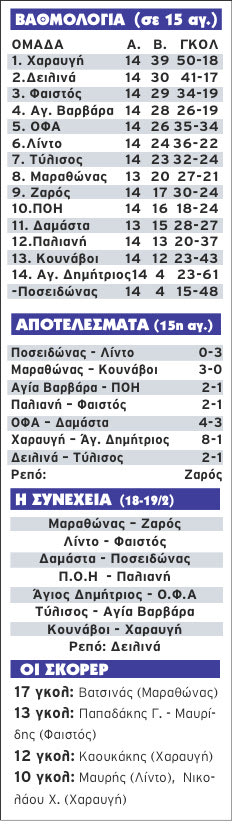 Για την γηπεδούχο ομάδα τα γκολ σημείωσαν οι Γερομαρκάκης και Βιτσαράς, ενώ για τους Μεσαρίτες βρήκε… δίχτυα ο Παπαδάκης – Μαυρίδης. Την έδρα της εκμεταλλεύτηκε η Αγία Βαρβάρα νικώντας με 2-1 τον ΠΟΗ (το γκολ ο Χαϊντίνι) με τον Πρίφτη να πετυχαίνει και τα δύο της τέρματα.