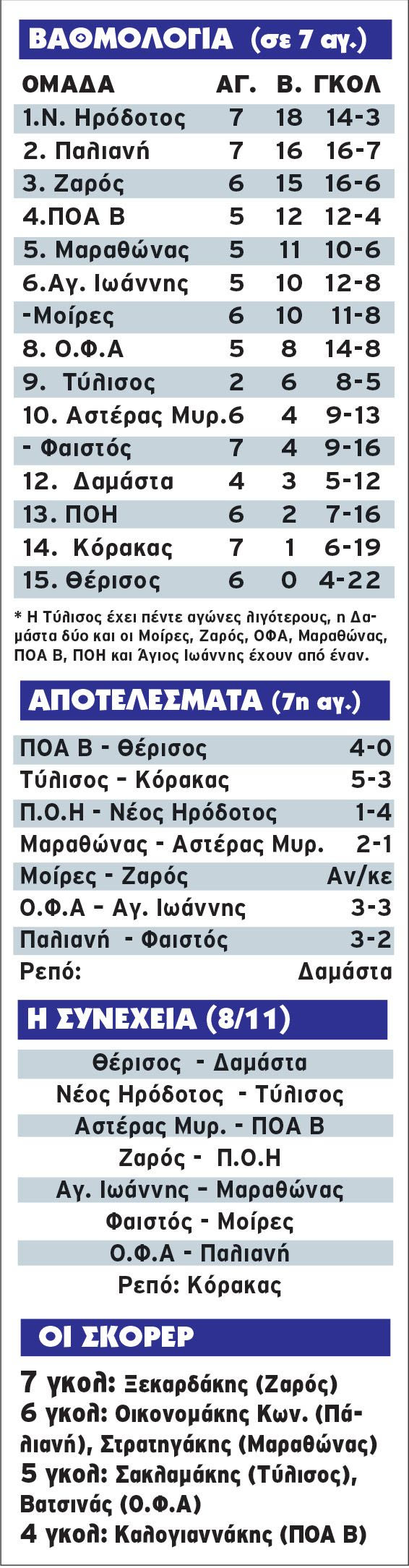 Δύο βαθμούς πιο πίσω από τον Ν. Ηρόδοτο βρίσκεται η Παλιανή, η οποία με τα τέρματα των Βιτσαρά, Αμπαρτζάκη και Οικονομάκη Κων. επικράτησε με 3-2 της Φαιστού (σκόραραν οι Νιολάκης και Παπαδάκης (Μαυρίδης) στο Βενεράτο.
