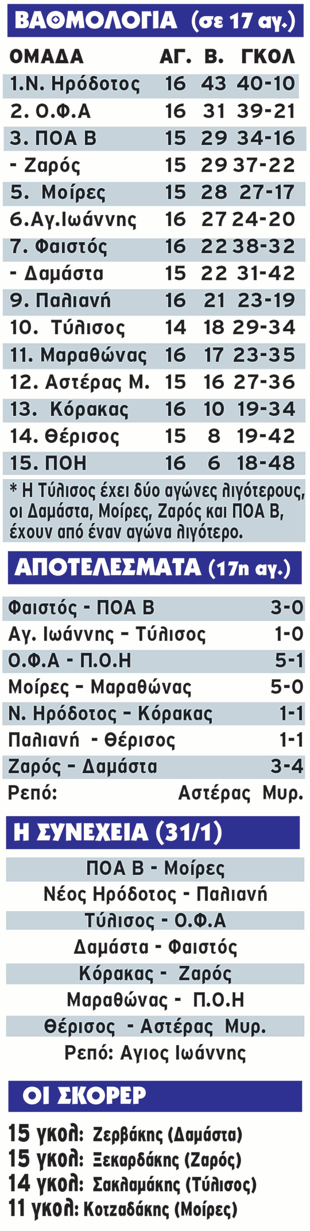 Στην δεύτερη θέση «σκαρφάλωσε» ο Ο.Φ.Α μετά το επιβλητικό 5-1 επί του Π.Ο.Η στο Αρκαλοχώρι. Δύο φορές σκόραρε ο Μαυράκης και από μία οι Σπανουδάκης, Λουλάκης και Ελευθερίου. Για τους φιλοξενούμενους, το τέρμα σημείωσε ο Λυραράκης.