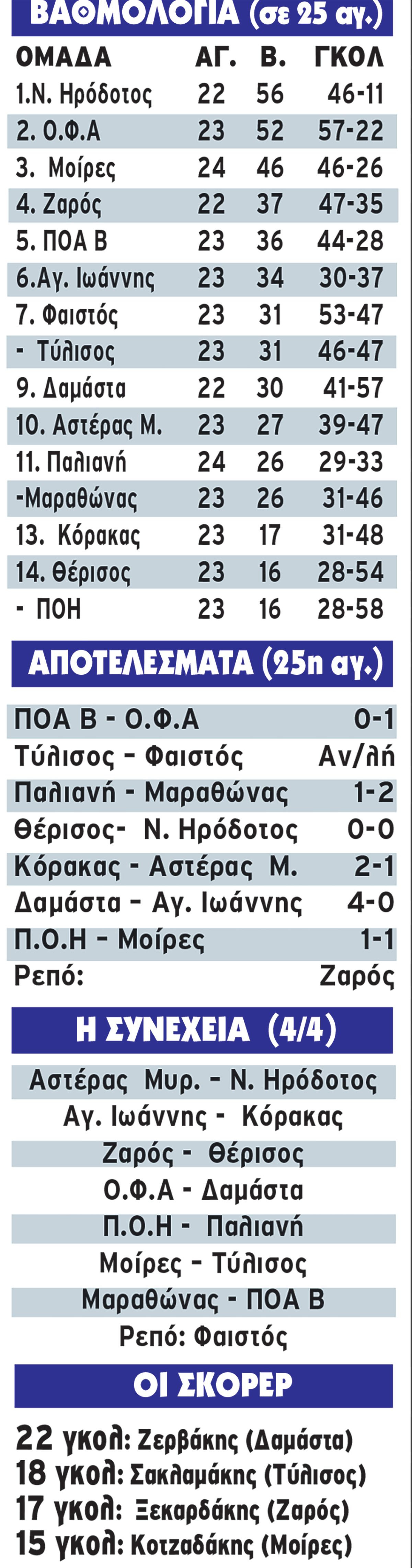 Για την 25η αγωνιστική, πολύτιμη ισοπαλία (0-0) πήρε η Θέρισος στο ματς με τον πρωτοπόρο Νέο Ηρόδοτο στην Ν. Αλικαρνασσό. Στην πιο σημαντική στιγμή του αγώνα, ο τερματοφύλακας των φιλοξενούμενων, Γεναράκη,ς απόκρουσε το πέναλτι του Γ. Κοιλιάρα.