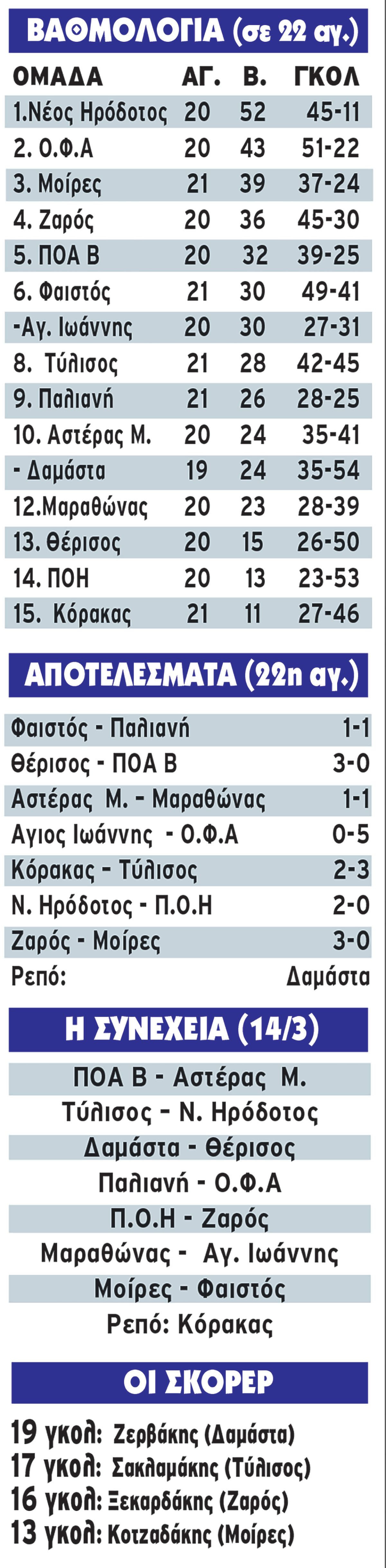 Πετυχαίνοντας την 17η νίκη του (σε 20 ματς) ο Νέος Ηρόδοτος παραμένει σε… απόσταση ασφαλείας εννέα βαθμών από τον δεύτερο ΟΦΑ και έχει αποκτήσει ένα σαφές προβάδισμα… τίτλου στην φετινή Α2 ΕΠΣΗ, μετά από 22 αγωνιστικές.