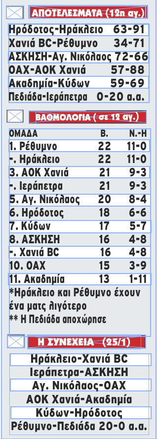 ΑΓ. ΝΙΚΟΛΑΟΣ (Κριμίλης): Σπηλιόπουλος 10, Βλαχάκης 17(4), Αντιφυλιώτης 19(4), Μήλας 10, Γιαμνιαδάκης 1, Γκαμπέλης 5(1), Σταυρακάκης, Σκανδαλάκης 4.