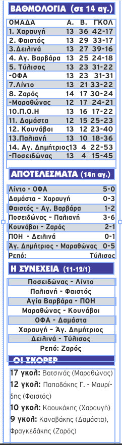 Στην τρίτη θέση «σκαρφάλωσαν» τα Δειλινά, που πέρασαν νικηφόρα με 1-0 από το «Γ. Σκουρέλλου» κόντρα στον ΠΟΗ χάρις το τέρμα του Βρετού. Το Λίντο «σκόρπισε» με το ευρύ 5-0 τον ΟΦΑ με πρωταγωνιστή τον Μαυρή, ο οποίος πέτυχε χατ τρικ. Τα άλλα δύο τέρματα σημείωσαν οι Μαυράκης και Παχυγιαννάκης.