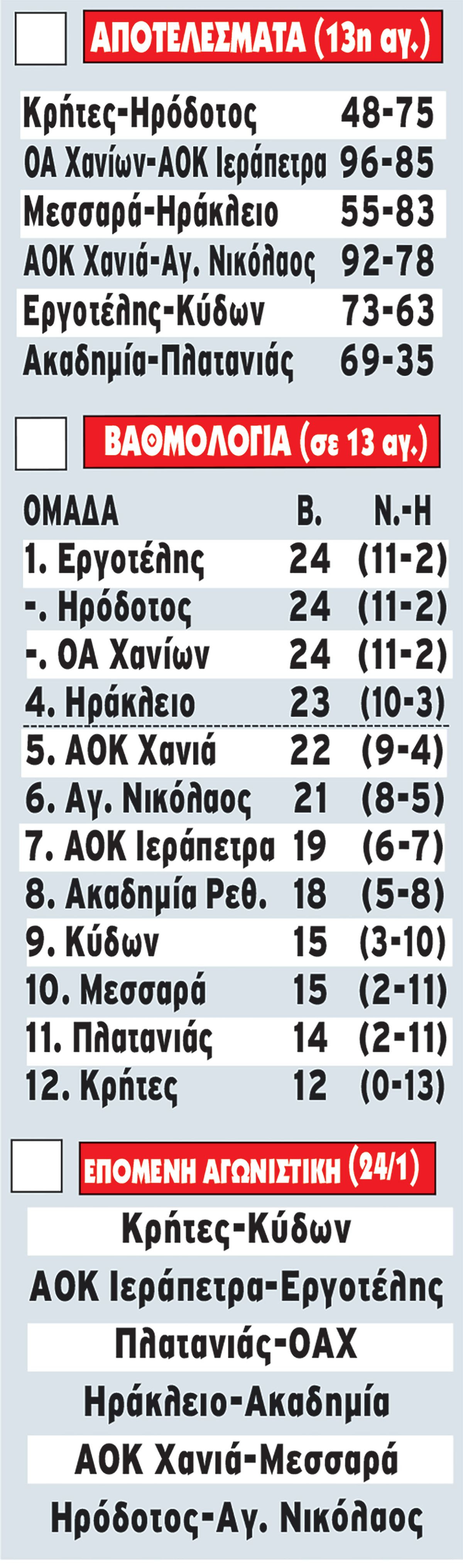 Εργοτέλης, Ηρόδοτος, ΟΑΧ συνεχίζουν να βρίσκονται στην κορυφή του πρωταθλήματος μπάσκετ της ΕΚΑΣΚ μετά και την 13η αγωνιστική του πρωταθλήματος. Αναλυτικά: