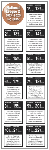 Στην NL2 έχουμε ξανά τον Εργοτέλη που 6 Οκτωβρίου ξεκινά εκτός έδρας κόντρα στον Ζωγράφου. Εδώ έχουμε 5 ομίλους με πλέι οφς σκαι πλέι άουτς χωρίς να μεταφέρονται αποτελέσματα πρωταθλήματος.