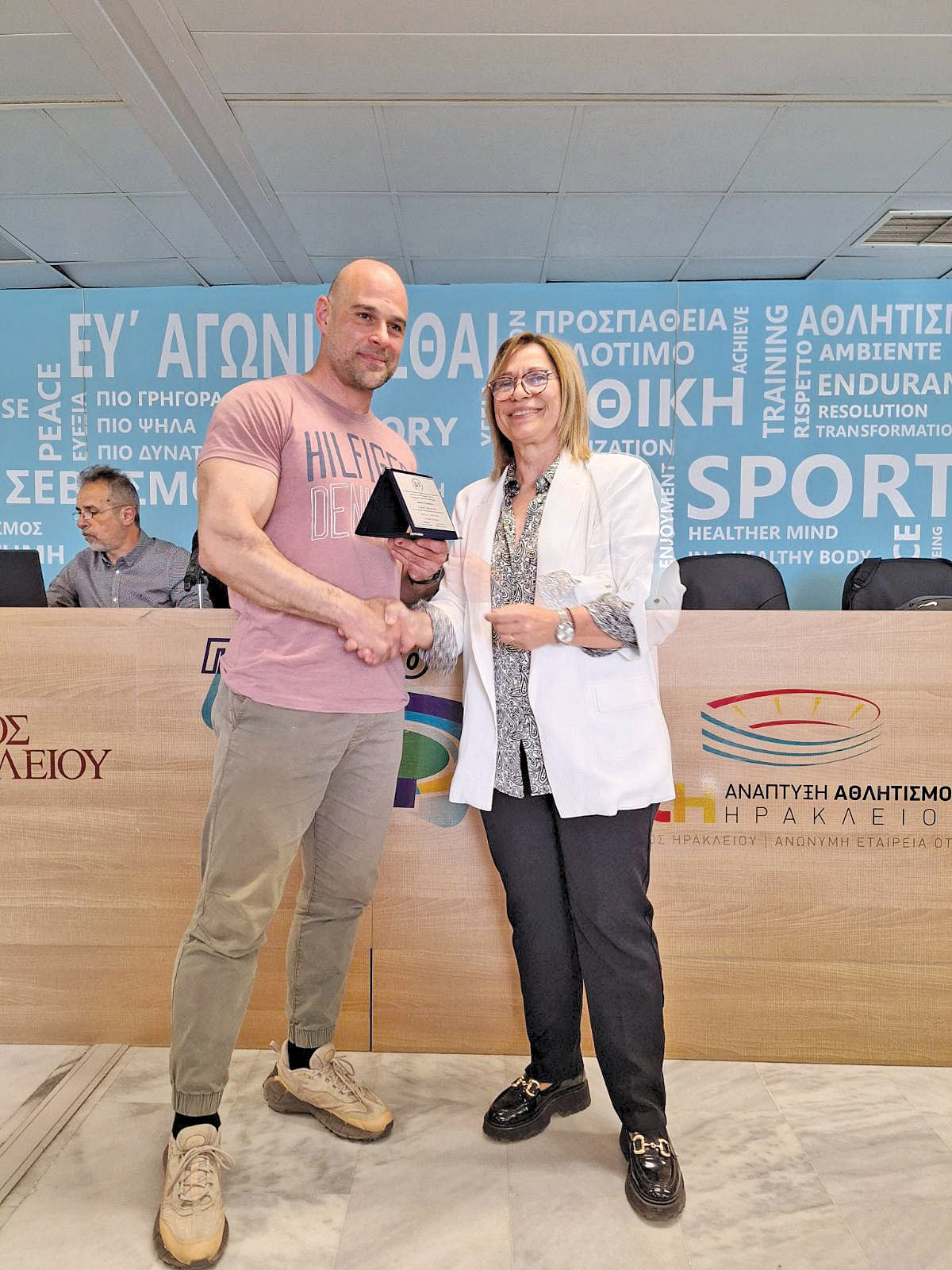 Ελπίζουμε να υπάρξουν ευήκοα ώτα και επιφυλασσόμαστε να επανέλθουμε με πιο συγκεκριμένο τροπο». Η Ένωση Πτυχιούχων Φυσικής Αγωγής Ν. Ηρακλείου τίμησε στην διημερίδα τους εξής: Τον ομότιμο καθηγητή Ηρακλή Κόλλια από τους πρωτοπόρους της Επιστήμος της Εμβιομηχανικής στη χώρα μας για την πολυετή και πολύτιμη προσφορά του στην Επιστήμη της Φυσικής Αγωγής και του Αθλητισμού και στην Παιδεία και τον Πτυχιούχο Φυσικής Αγωγής & Αθλητισμού και αρχιφύλακας της ΕΛ.ΑΣ Γιάννη Κουρούπη, για την εξαίρετη πράξη του να συμμετέχει με αυτοθυσία στη διάσωση των πιλότων που βρισκόταν σε κίνδυνο μετά την πτώση του αεροπλάνου τους στη θαλάσσια περιοχή του Κακού Όρους το 2022.