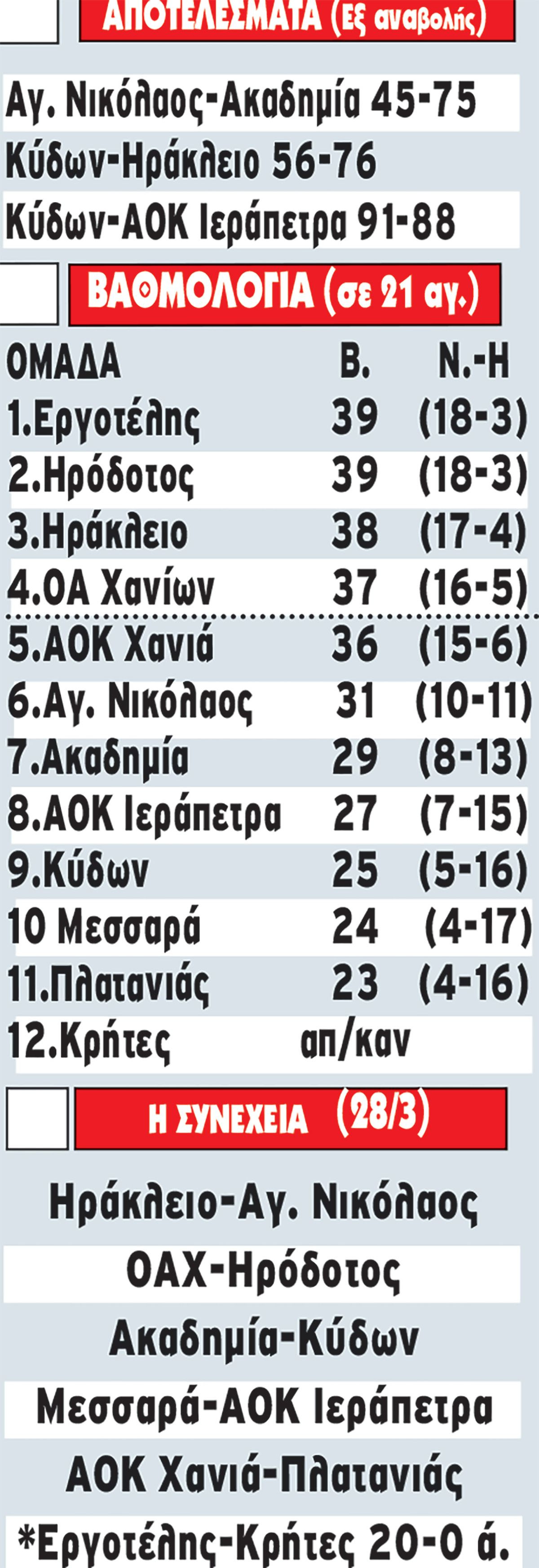 Απομένει πλέον μία εκκρεμότητα, που αφορά το εξ αναβολής παιχνίδι στο Λασίθι ανάμεσα σε Ιεράπετρα και Πλατανιά, ενώ η τελευταία, 22η αγωνιστική, θα διεξαχθεί την επόμενη εβδομάδα πριν από τα πλέι οφ.
