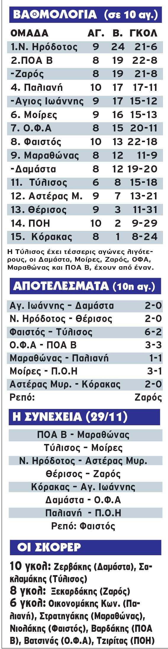 Στο -5 (μαζί με τον Ζαρό που είχε ρεπό) από την κορυφή βρίσκεται ο ΠΟΑ Β, που αν και έχανε με 3-1 από τον Ο.Φ.Α κατέφερε να φύγει από το Αρκαλοχώρι με ένα βαθμό (3-3). Για τους γηπεδούχους σκόραραν οι Βατσινάς, Μουρτζάκης και Καουκάκης, ενώ για την ομάδα του Ατσαλένιου δύο φορές βρήκε δίχτυα ο Βαρδάκης και μία ο Καλογιαννάκης.