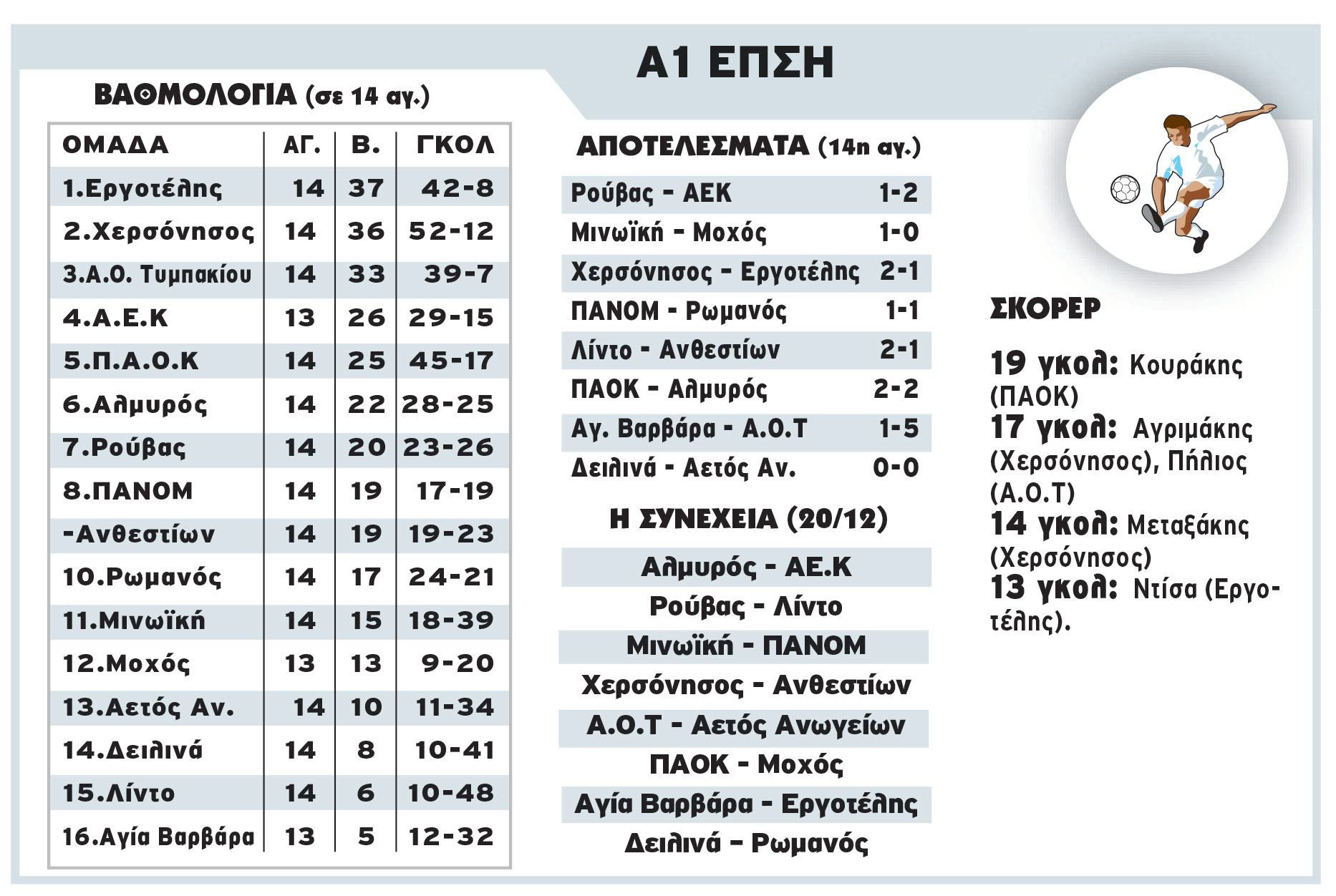 Έλαβε τέλος το αήττητο και το νικηφόρο σερί (11 αγωνιστικών) του Εργοτέλη στην Χερσόνησο (8η σερί νίκη) σε ένα ματς που τα… είχε όλα. Όγδοη συνεχόμενη νίκη και για τον τρίτο Α.Ο.Τ (5-1 στην Αγία Βαρβάρα) και πέμπτη για την ΑΕΚ, που «άλωσε» την Γέργερη (2-1 τον Ρούβα).