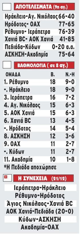 Την ήττα του Αγίου Νικολάου εκμεταλλεύθηκε ο ΑΟΚ Χανιά που τον «έπιασε» στην 4η θέση, κερδίζοντας άνετα (85-41) τον Χανιά BC. Τέλος, με εντός έδρας νίκες προχώρησαν ο Ηρόδοτος (77-65 τον ΟΑΧ) και η ΑΣΚΗΣΗ (75-64 την Ακαδημία).