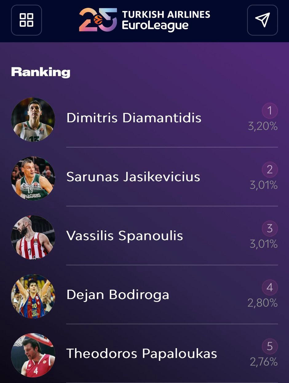 Ο κορυφαίος των κορυφαίων είναι ένας και ακούει στο όνομα Δημήτρης Διαμαντίδης, με τον μύθο του Παναθηναϊκού να αναδεικνύεται ως ο καλύτερος παίκτης στην ιστορία της Eυρωλίγκα με ποσοστό 3,2%.