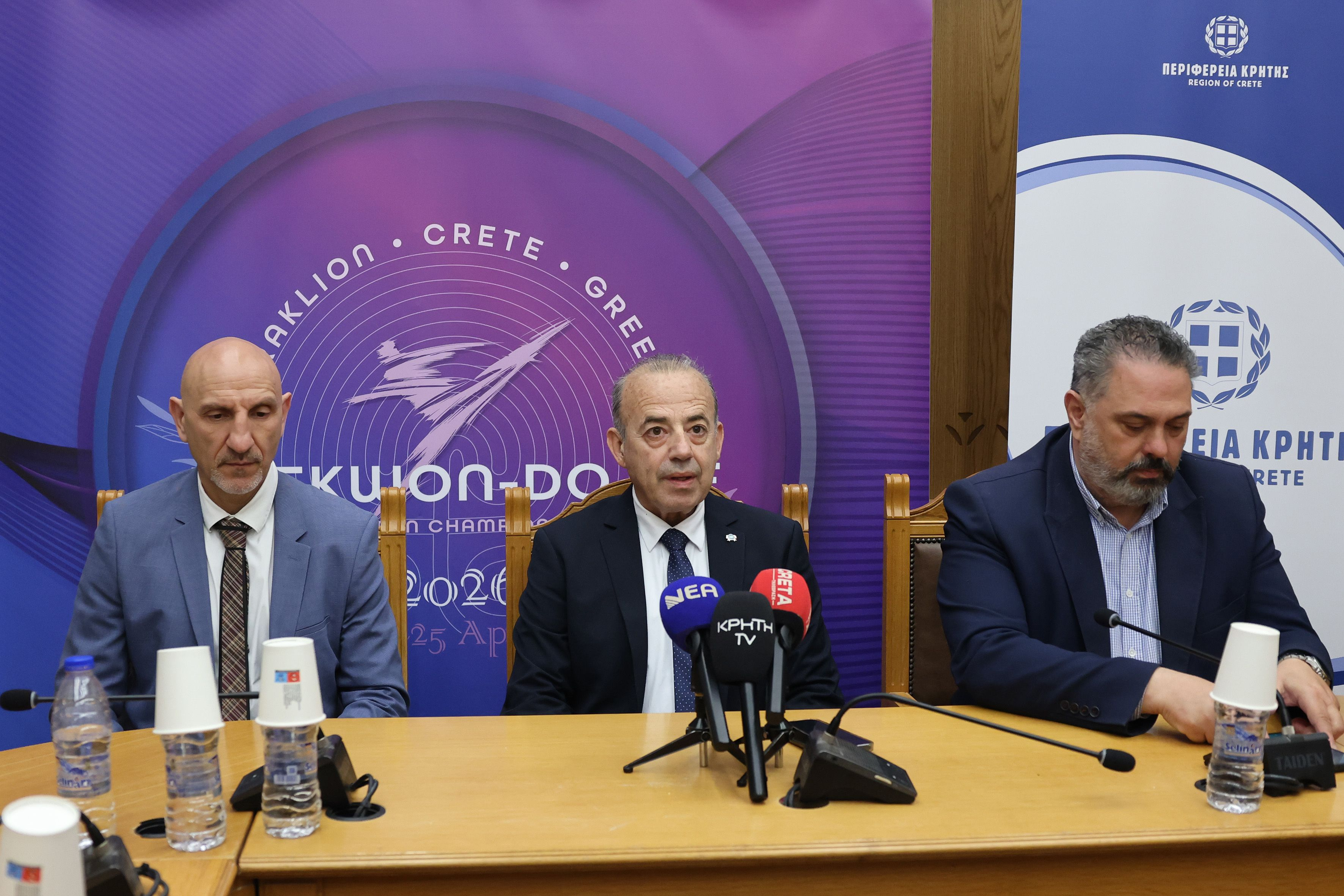 Στη συνέντευξη Τύπου παραβρέθηκαν ο Αναπληρωτής Περιφερειάρχης Κρήτης Γιώργος Πιτσούλης, ο Αντιπεριφερειάρχης Ηρακλείου Νίκος Συριγωνάκης, ο Πρόεδρος της Αθλητικής Ομοσπονδίας Taekwon-Do Ελλάδος και Αντιπρόεδρος της Ευρωπαϊκής Ομοσπονδίας Αναστάσιος Βαλασιάδης, ο Ταμίας της Ομοσπονδίας και Πρόεδρος της Τεχνικής Επιτροπής Μιχάλης Ζωγράφος καθώς και τα μέλη της Οργανωτικής Επιτροπής Ηλίας Τζανίδης και Άκης Βασιλιάς.
