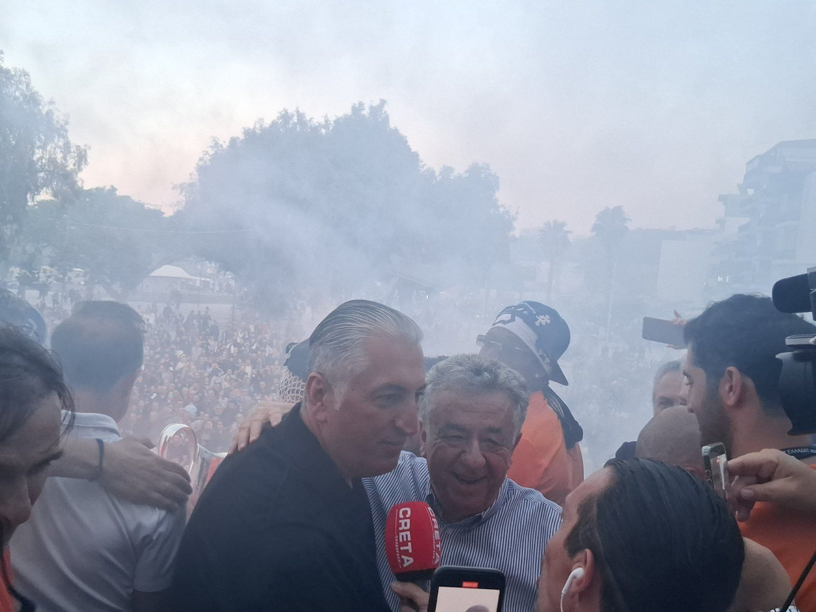 Στην συνέχεια ο πρόεδρος της Κρητικής ομάδας Μιχάλης Μπούσης με τον γιο του Δημήτρη και με τους παίκτες Λαμπρόπουλο και Φούντα και τον προπονητή Χρήστο Κόντη ανέβηκαν στο μπαλκόνι όπου τους υποδέχθηκε ο Αρναουτακης και αλλα στελέχη της Περιφέρειας.