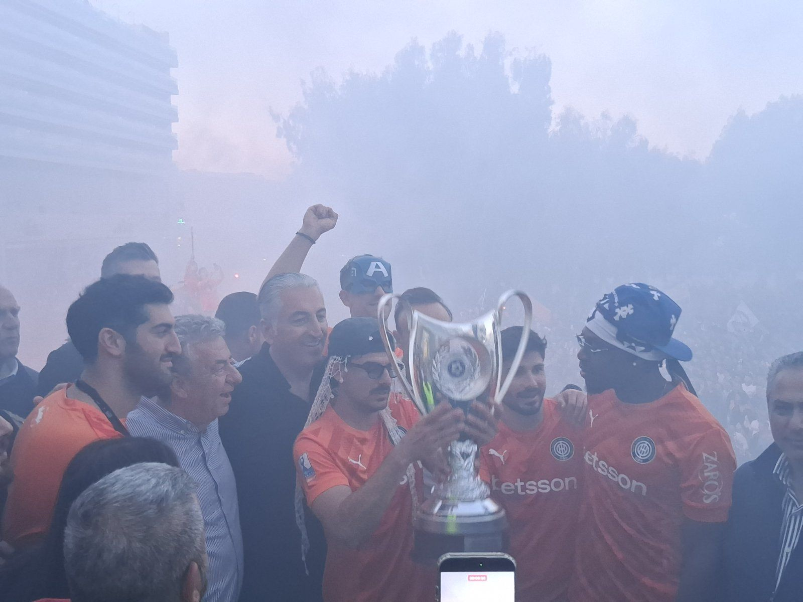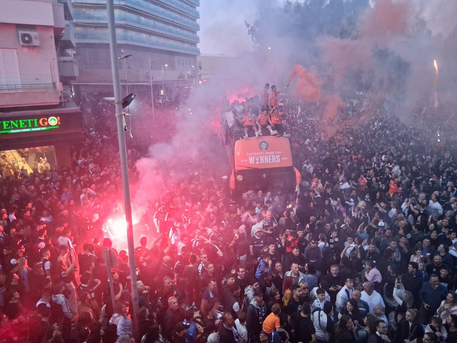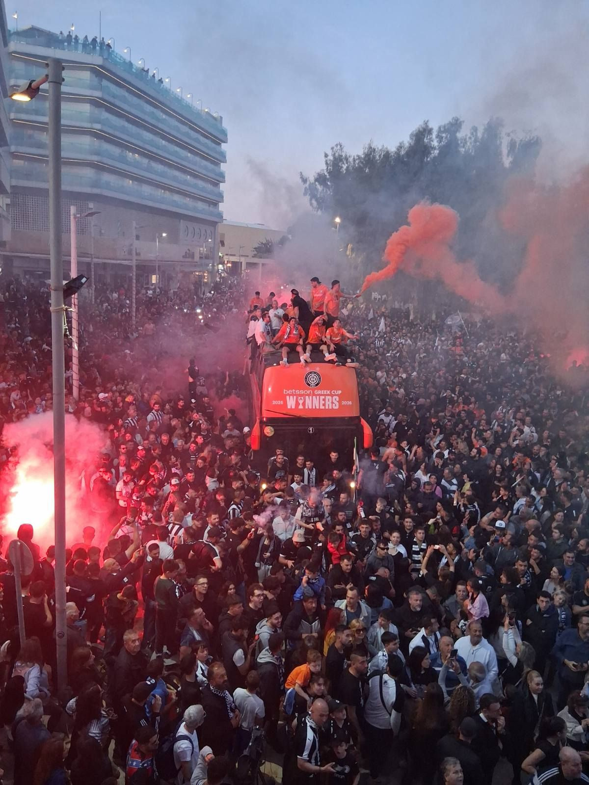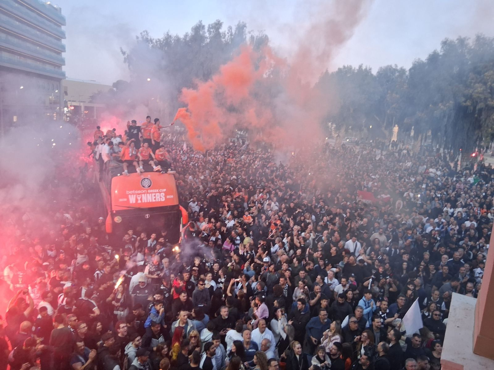 Οι παίκτες και το τεχνικό επιτελείο με το πορτοκαλί πούλμαν έφτασε λίγο μετά τις 7:30 το βράδυ με τους χιλιάδες φίλους να τους αποθεώνουν.
