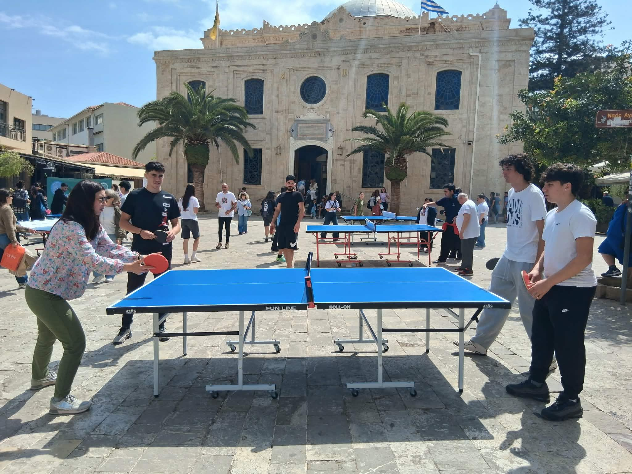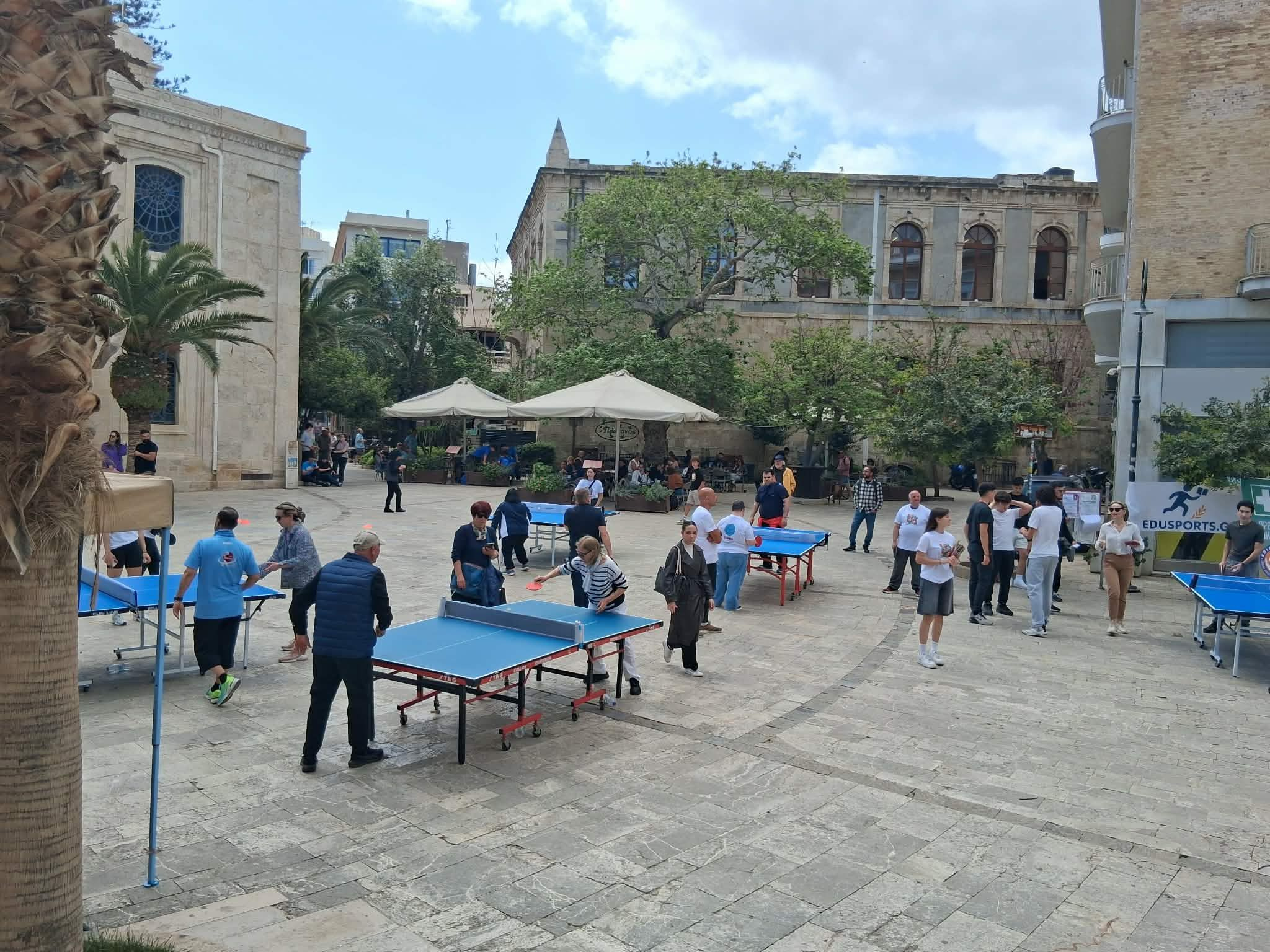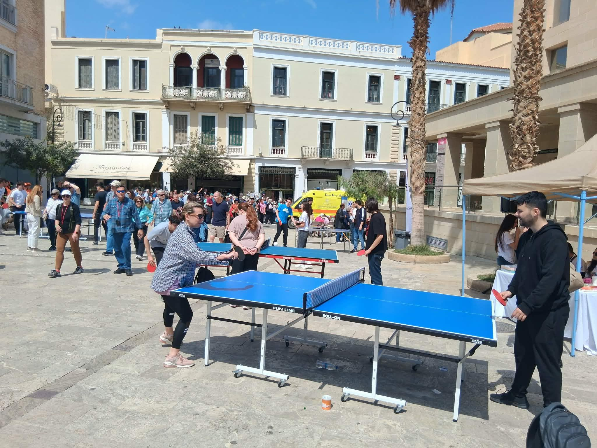 Μικροί και μεγάλοι, είχαν την ευκαιρία να δοκιμάσουν τις δυνάμεις τους στα τραπέζια του πινγκ – πονγκ που στήθηκαν στην Πλατεία Αγίου Τίτου, σε μια όμορφη δράση που στήριξε η Περιφέρεια Κρήτης και η Πανελλήνια Ομοσπονδία Νόσου Αλτσχάιμερ και Συναφών Διαταραχών.