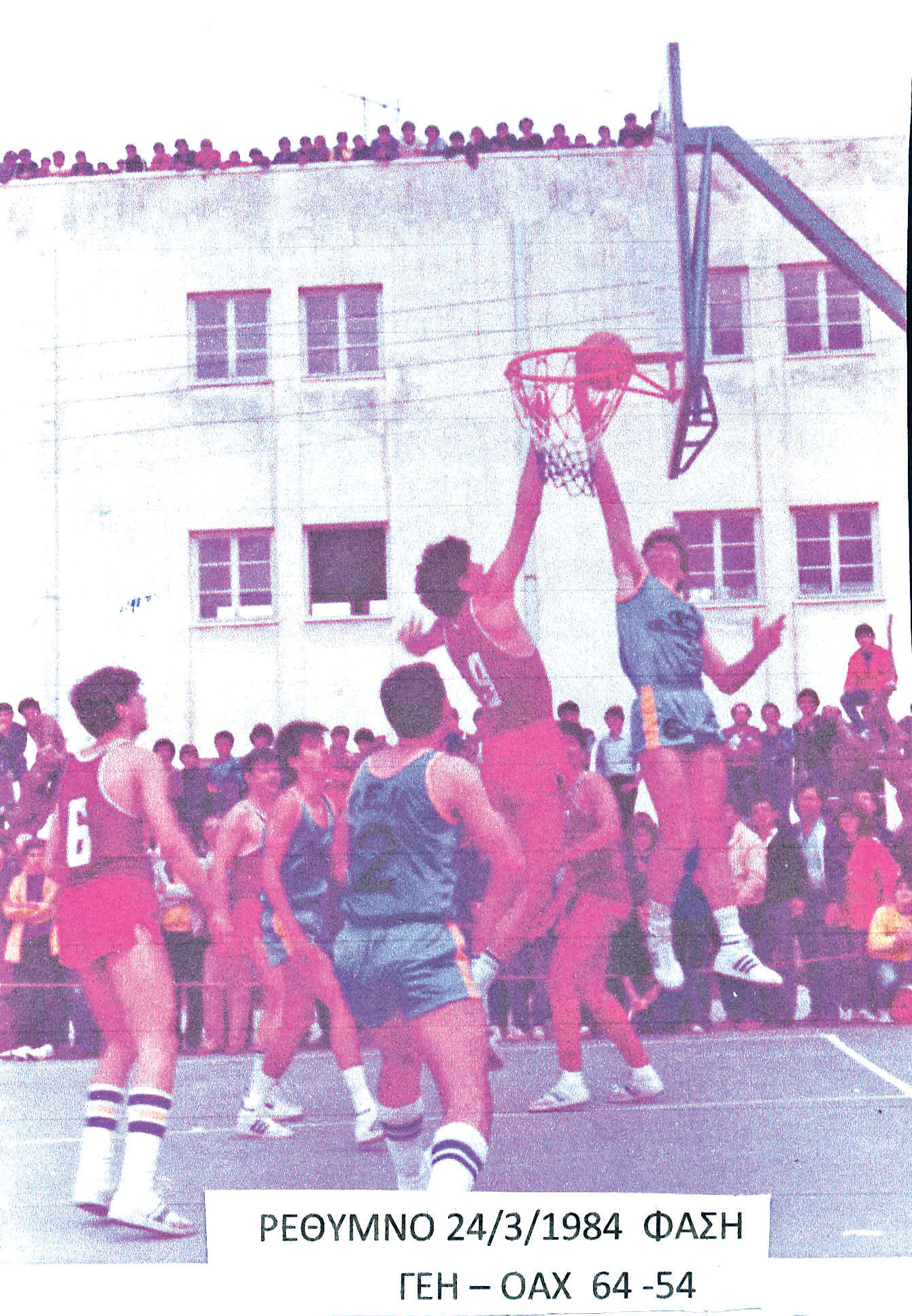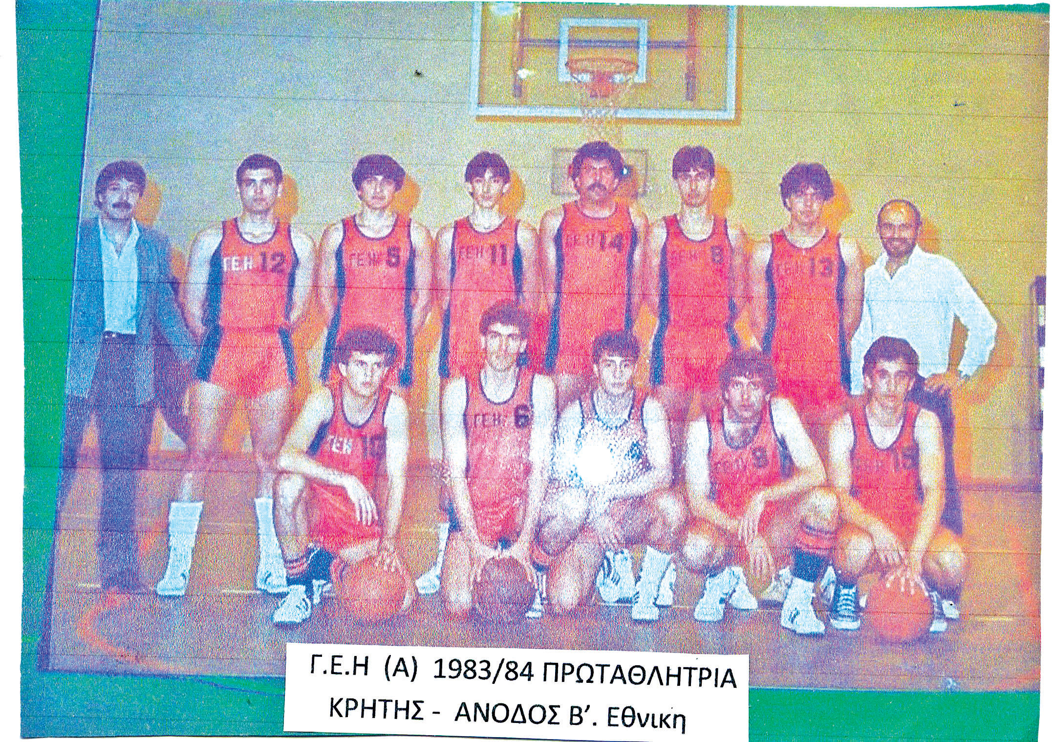Η ΓΕΗ το 1984 (24/3/84) στον τελικό αγώνα μπαράζ του πρωταθλήματος ανδρών Κρήτης κέρδισε 64-54 (38-24) τον ΟΑΧ και ανέβηκε στη Β’ Εθνική έχοντας στην 10άδα της 7 εφήβους και 3 άνδρες. Συγκεκριμένα κόντα στον ΟΑΧ είχαμε τους εφήβους Σαατσάκη, Γεωργακάκη, Περαντωνάκη (12π.), Πετράκη Μ. (10), Διαλεκτάκη (12), Καλαϊτζάκη, Αρχοντουλάκη (1) και τους άνδρες Χαρωνίτη Ι. (17), Βενέρη (8), Σπυριδάκη (4). Προπονητής Ν. Τούλης.