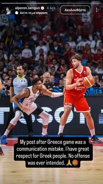 Σχεδόν ταυτόχρονα, ήρθε και η αντίδραση του Αλπερέν Σενγκούν. Ο Τούρκος NBAer ανέβασε ένα story στα social media στο οποίο ανέφερε πως η ανάρτηση που είχε κάνει μετά τον αγώνα Ελλάδα – Τουρκία ήταν ένα επικοινωνιακό λάθος και πως τρέφει σεβασμό για τον ελληνικό λαό.