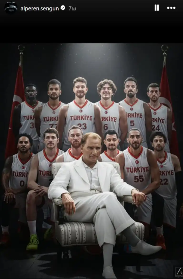 Παράλληλα, ο Σενγκούν πόσταρε μια AI φωτογραφία που έδειχνε τον Κεμάλ σε μια καρέκλα και πίσω του όλους τους παίκτες της εθνικής ομάδας μπάσκετ της Τουρκίας.