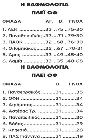 Καθοριστικό ενδέχεται να είναι το Σαββατοκύριακο στην μάχη της κορυφής αλλά και της ουράς στην Σούπερ Λιγκ αφού είναι πιθανό να κριθεί τόσο ο τίτλος όσο και ο υποβιβασμός. Στα πλέι οφ το μεγάλο παιχνίδι της 8ης αγωνιστικής γίνεται αύριο στην Τούμπα με τον ΠΑΟΚ να υποδέχεται την ΑΕΚ η οποία με νίκη ουσιαστικά στέφεται πρωταθλήτρια καθώς θα χρειάζεται μια νίκη στα δυο επόμενα ματς(την τελευταία αγωνιστική παίζει εντός με την Λαμία) για να κατακτήσει για δεύτερη σερί σεζόν το πρωτάθλημα. Για τα πλέι άουτ έχουμε σήμερα την 6η και προτελευταία αγωνιστική με τις αναμετρήσεις Αστέρας Τρ.-ΟΦΗ, Παναιτωλικός-Ατρόμητος, Κηφισιά-ΠΑΣ Γιάννινα, Βόλος-Πανσερραϊκός με τους γηπεδούχους στα τρία τελευταία ματς να θέλουν μόνο νίκη και τον ΟΦΗ να ψάχνει τουλάχιστον τον βαθμό.
