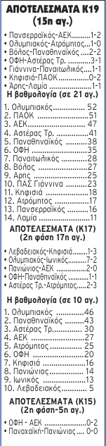 *Αν και πραγματοποίησε καλή εμφάνιση, η Κ15 του ΟΦΗ ηττήθηκε με σκορ 2-0 από την αντίστοιχη της ΑΕΚ, για την 5η αγωνιστική του 2ης φάσης του Δ’ Ομίλου του πρωταθλήματος Σούπερ Λιγκ, σε ένα ματς χωρίς βαθμολογικό ενδιαφέρον για την κρητική ομάδα, η οποία έχει ήδη εξασφαλίσει την 1η θέση του ομίλου και την συμμετοχή της στους αγώνες μπαράζ με στόχο την πρόκριση στο Final 4.