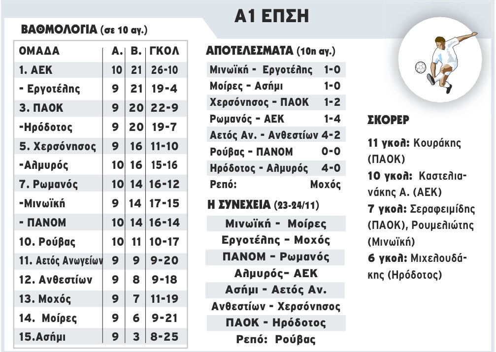 Η ήττα του πρωτοπόρου Εργοτέλη από την Μινωϊκή σε συνδυασμό με τις σημαντικές νίκες της ΑΕΚ και του ΠΑΟΚ (εκτός έδρας), αλλά και του Ηροδότου στην Ν. Αλικαρνασσό, αναζωπύρωσε το ενδιαφέρον για την κατάκτηση του τίτλου, αφού πλέον το… καρέ έχει ξεχωρίσει από τις υπόλοιπες ομάδες της Α1 ΕΠΣΗ και ενώ συμπληρώσαμε το 1/3 του πρωταθλήματος (10η αγωνιστική).