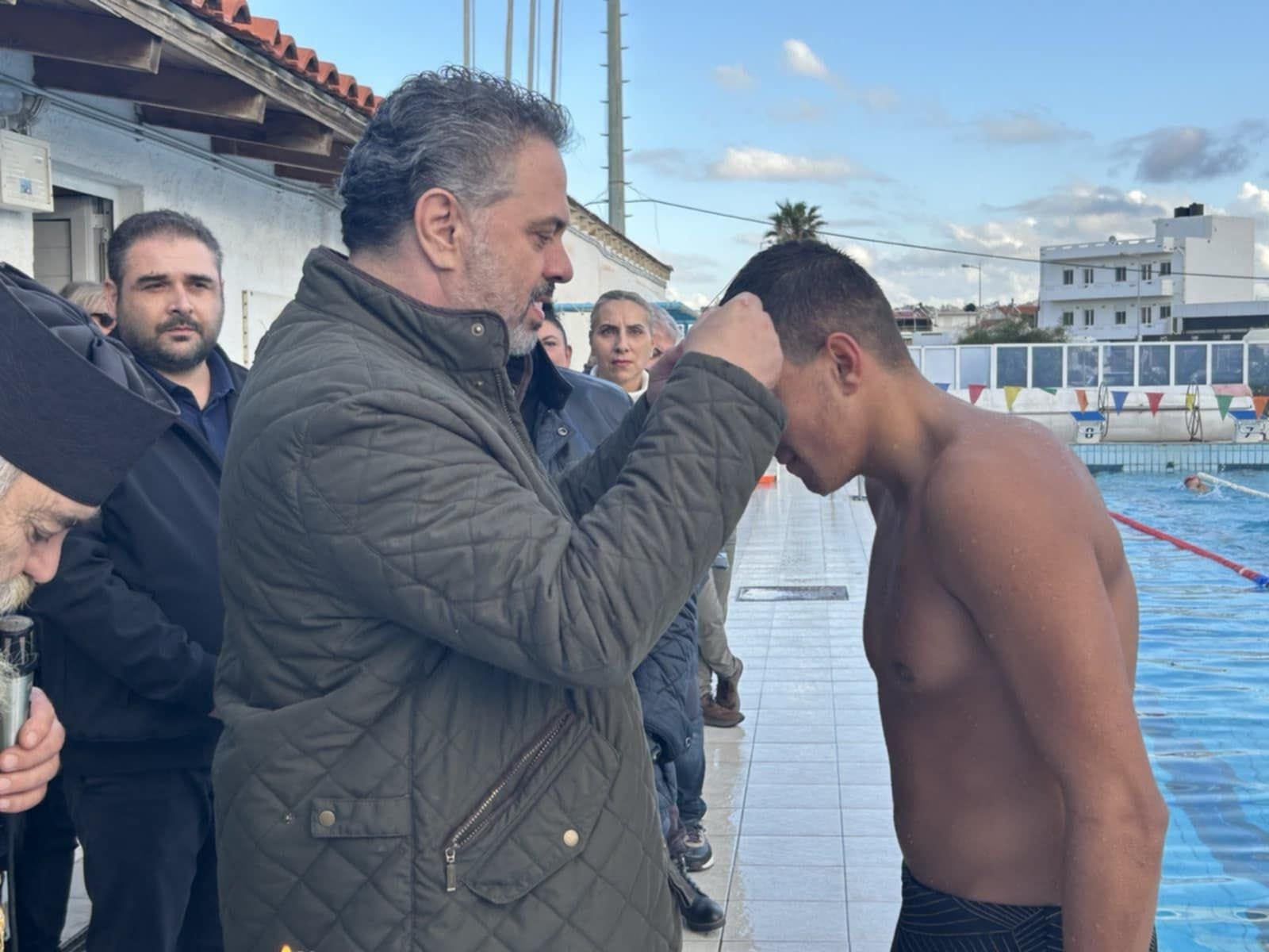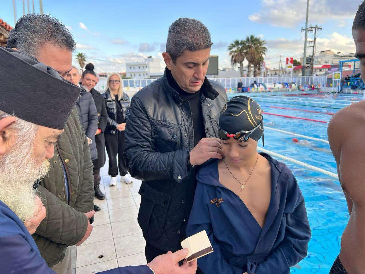 Οι κολυμβητές Εμμανουήλ Καλταβερίδης του Τρίτωνα και Νικόλαος Στεφανάκης απο τους Πρωταθλητές, έπιασαν το σταυρό και έλαβαν συμβολικό δώρο, από ένα χρυσό σταυρουδάκι.