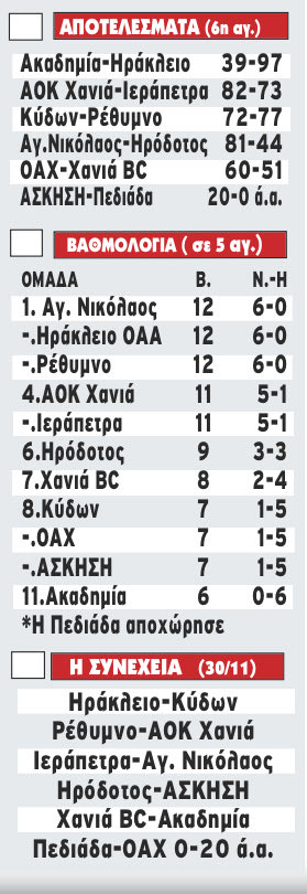 Ο Αγιος Νικόλαος και το «Ηράκλειο» ΟΑΑ συνέχισαν με εμφατικές νίκες (81-44 τον Ηρόδοτο και 97-39 την Ακαδημία αντίστοιχα) ενώ ο ΟΑΧ έκανε σεφτές στις επιτυχίες, κερδίζοντας με 60-51 τον Χανιά BC.
