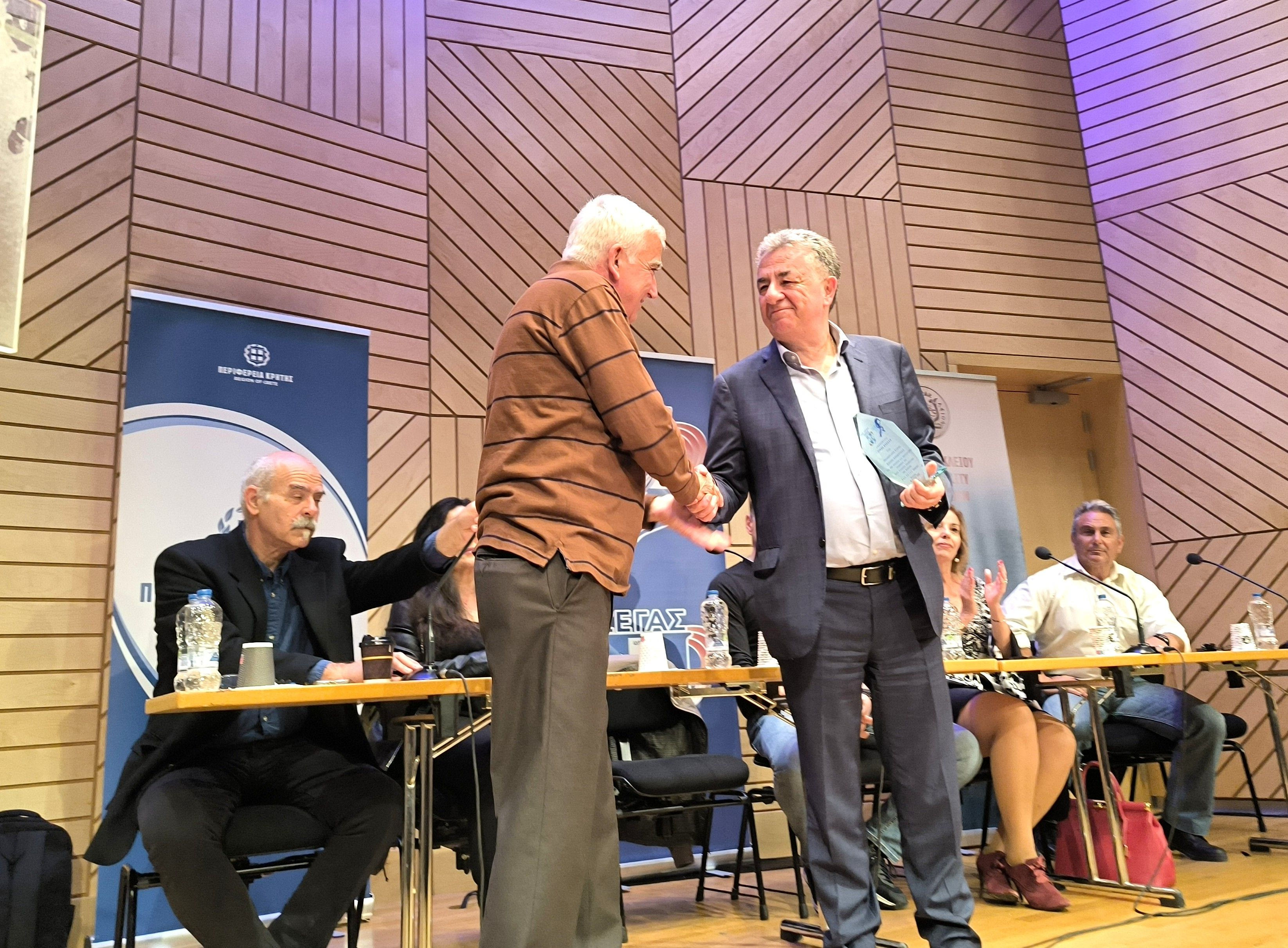 Στο πλαίσιο της εκδήλωσης ο Περιφερειάρχης Σταύρος Αρναουτάκης βράβευσε την πρώτη γυναίκα Πρόεδρο της ΕΑΣ ΣΕΓΑΣ Κρήτης Φωτεινή Παπαδάκη και τον πρώην Πρόεδρο της ΕΑΣ ΣΕΓΑΣ Κρήτης Σωτήρη Λαβούτα.