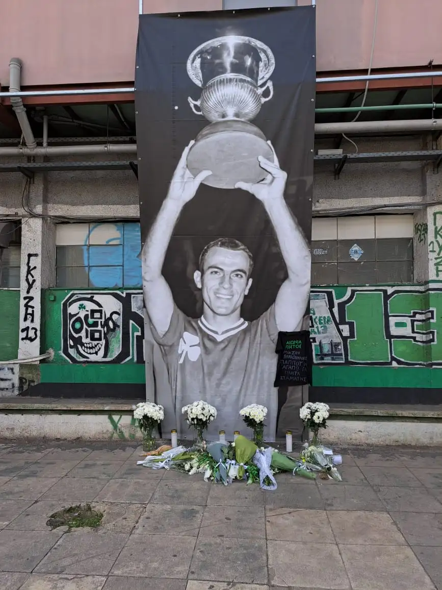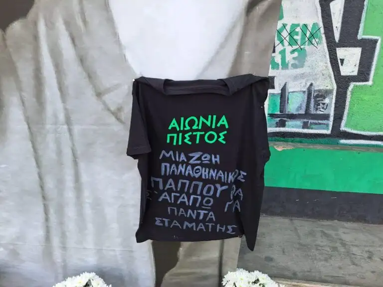 “Αιώνια πιστός. Μια ζωή Παναθηναϊκός. Παππού θα σ’ αγαπώ για πάντα, Σταμάτης” είναι το μήνυμα που αναγράφεται πάω στην μπλούζα που άφησε ο εγγονός του “στρατηγού” στο μπάνερ που έχει τοποθετηθεί στο “Απ. Νικολαΐδης” από το Σάββατο (25.01.2025).