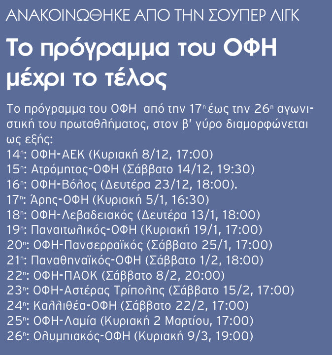 Από τότε έχει δυο ήττες και δυο ισοπαλίες στο πρωτάθλημα καθώς και μια ήττα στο κύπελλο. Αυτός είναι και ο λόγος που έχει βρεθεί με ο τέλος του α΄ γύρου στην 10η θέση έστω και ισόβαθμος με Αστέρα Τρίπολης και Πανσερραικό. Μέχρι τώρα ο ΟΦΗ έχει στο πρωτάθλημα 4 νίκες 4 ισοπαλίες και 5 ήτες με 17-22 γκολ ενώ στο Ηράκλειο 1 νίκη 2 ισοπαλίες και 3 ήττες με 7-10 γκολ.