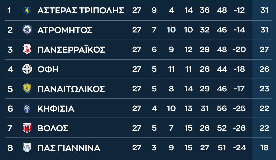 Η ισοπαλία της Κηφισιάς με τον ΟΦΗ όμως κρατά τους Θεσσαλούς κάτω από τη ζώνη του υποβιβασμού, καθώς η ομάδα των βορείων προαστίων έχει τη μεταξύ τους ισοβαθμία.