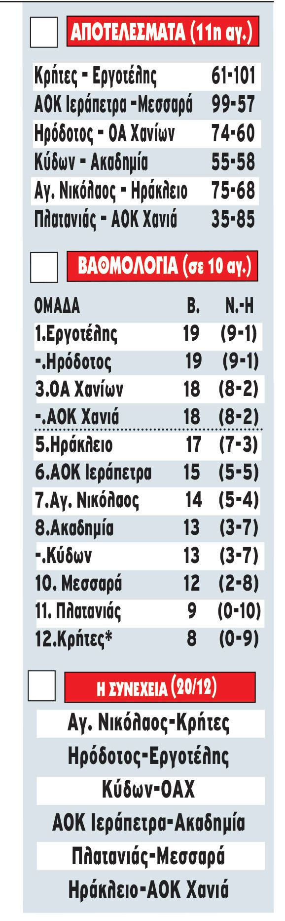 Εργοτέλης (Χριστοδούλου, Μαϊστρέλης): Μαματζάκης 11 (1), Παχιαδάκης 1, Πέτρου 18 (3), Λυβιάκης 23 (6), Πατεράκης, Μπαρλίας 15, Βιδάκης 5, Καλλέργης 15 (4), Τσικνάκης 2, Ορφανουδάκης 4, Αναστασάκης 7, Δάγλας.