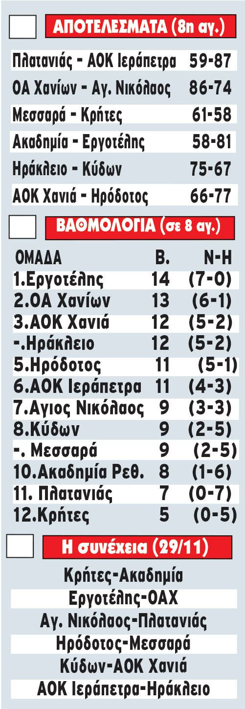 Ο Εργοτέλης συνεχίζει ακάθεκτος την πορεία του στην ΕΚΑΣΚ, ενώ την νίκη της 8ης αγωνιστικής πέτυχε ο Ηρόδοτος στα Χανιά. Να σημειώσουμε ότι ο προπονητής του Πλατανιά Τσιρέκας κάθισε για τελευταία φορά στον πάγκο μια και μετακόμισε στην Αθήνα λόγω διορισμού του.