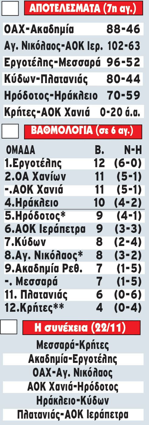 ΑΓΙΟΣ ΝΙΚΟΛΑΟΣ (Μάνος Καρλάφτης): Λαγουδάκης 22(4), Νικητάκης 26, Μήλας 14, Αντιφιλιώτης 13(3)
