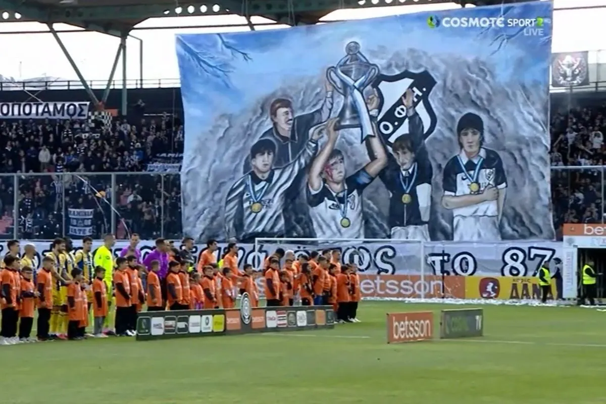 Την ώρα που έμπαιναν οι δύο ομάδες στον αγωνιστικό χώρο, ύψωσαν ένα κορεό με την ομάδα του Ευγένιου Γκέραρντ να σηκώνει στον ουρανό το τρόπαιο του 1987, στον αξέχαστο τελικό με τον Ηρακλή.