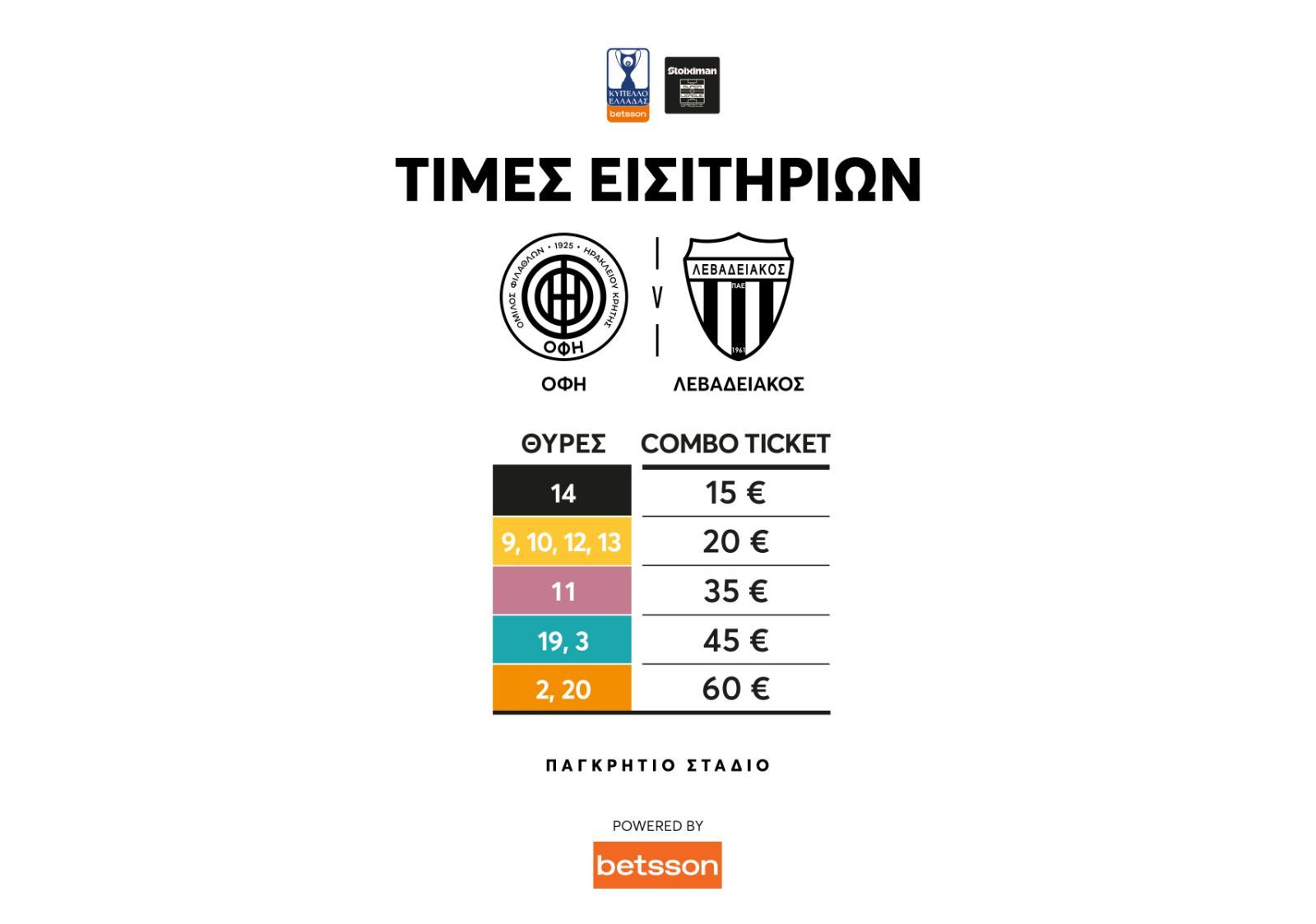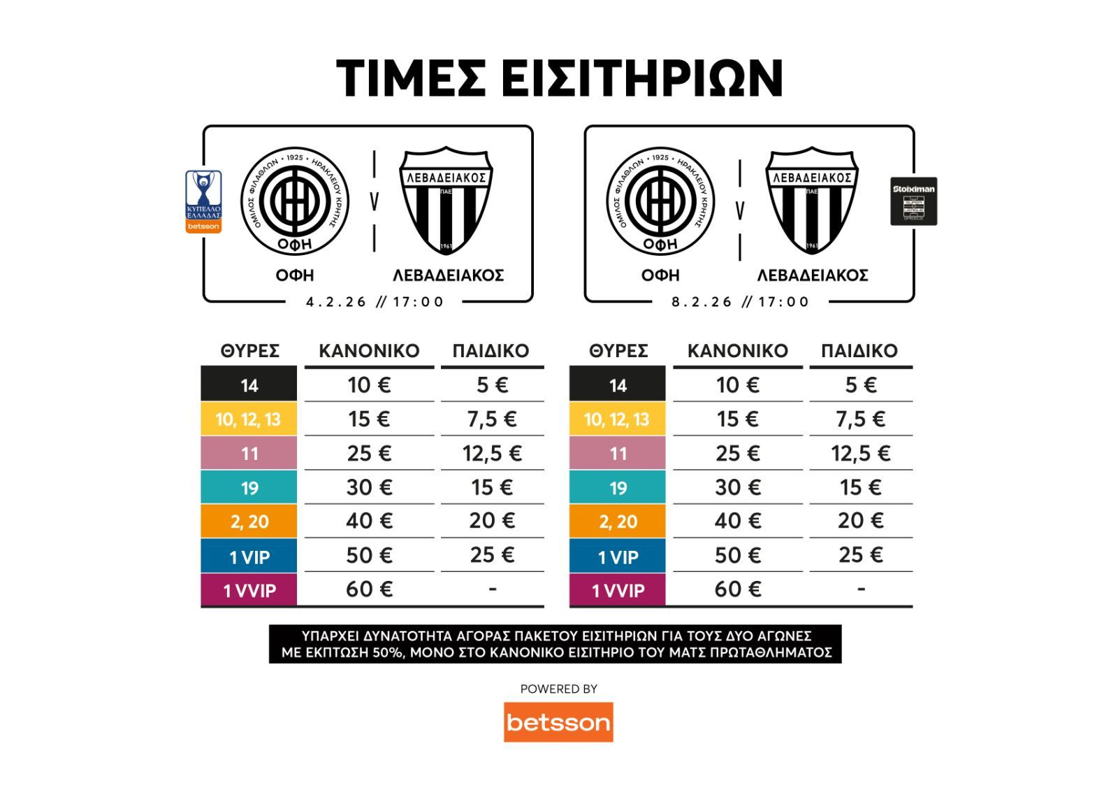 Οι τιμές του combo εισιτηρίου για όσους επιθυμούν να παρακολουθήσουν και τις δυο αναμετρήσεις του ΟΦΗ με τον Λεβαδειακό (4/2 & 8/2) είναι οι εξής: